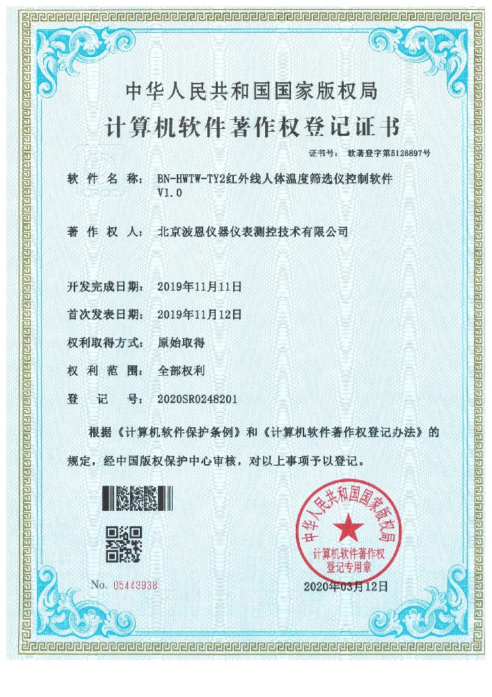 波恩儀器公司紅外線人體溫度篩選儀軟件著作權(quán)證書