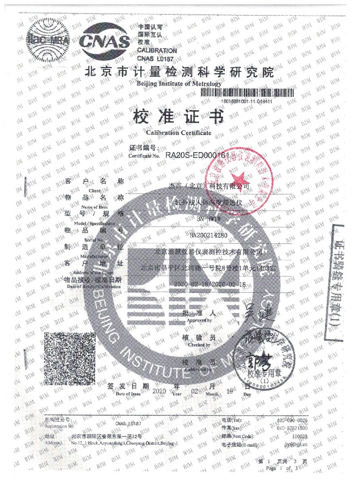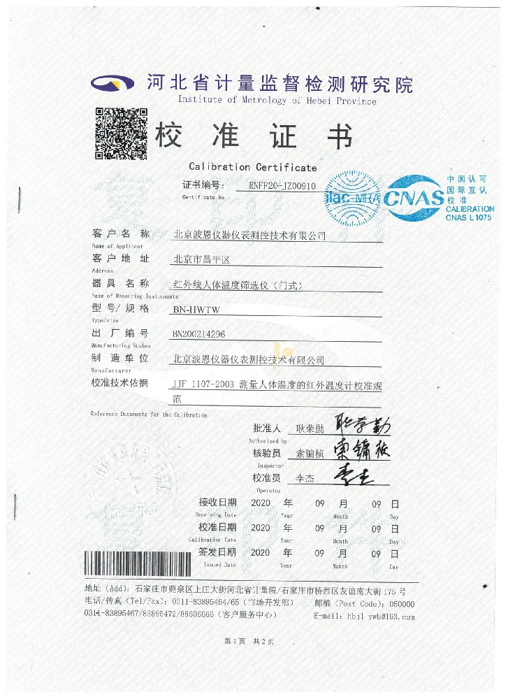 波恩儀器公司立柱式紅外線人體溫度篩查儀北京市計量院校準證書